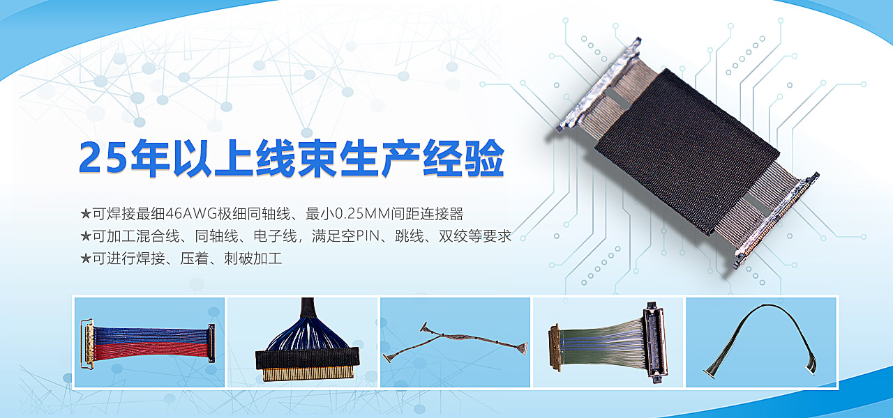 公司主營極細(xì)同軸線束、車載信號(hào)線束、航空頭線束、RF射頻線、電子接插件、微動(dòng)開關(guān)等